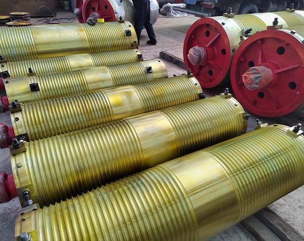 The drum group is the primary component of the lifting machinery. The drum is used to wind the wire rope in the lifting mechanism to transmit power. The drum group consists of a drum, a drum group, a gear coupling, a bearing frame and other components. The drum shaft is connected to the reducer through a gear coupling. The drum used for the crane with the wire rope fixed on the drum is a compound drum. There are spiral grooves at both ends of the drum, and the spiral directions are opposite. The two ends of the wire rope are fixed on the outer ends of the left and right spiral grooves respectively. The wire rope is generally fixed on the drum with a pressure plate. This fixing method is simple and easy to disassemble. In order to ensure safety, reduce the pressure on the fixed pressure plate or the force on the chess piece, and ensure that the object-picking device is lowered to the extreme position, in addition to the fixed rope loop, at least 2 turns of wire rope should be left on the drum. These turns of wire rope are called safety loops, also called load-reducing loops. Generally, cast iron no lower than HT20-40, ZG25, ZG35 cast steel or Q235B, Q345B steel plates are selected for welding.