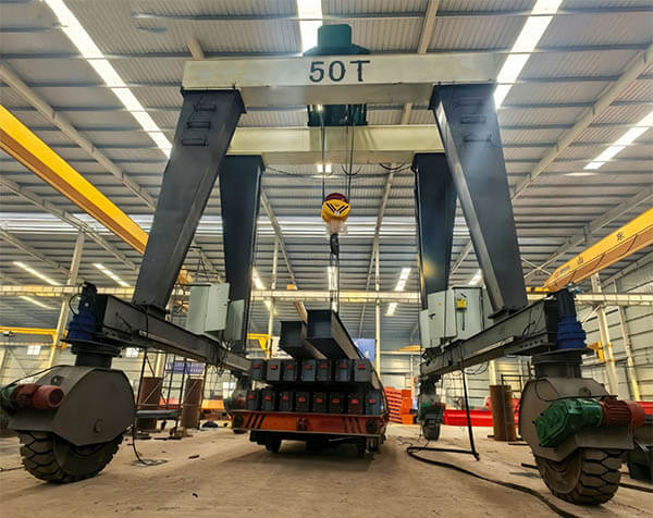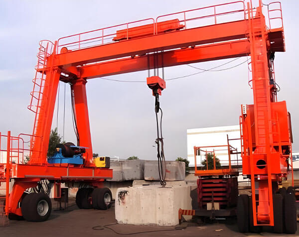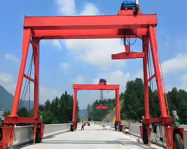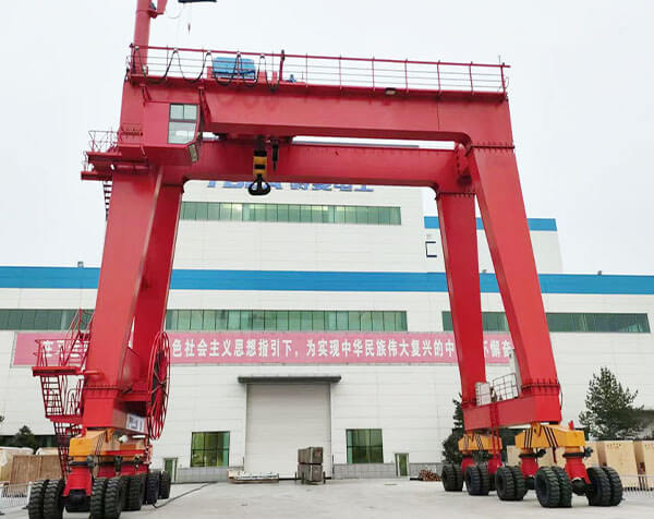 The essence of double beam tire gantry crane is a "movable gantry crane equipment": it has a gantry structure as a whole, with 4-8 large engineering tires (some models have all wheel steering) installed at the bottom of the door legs on both sides. The top of the gantry is equipped with a horizontally movable lifting trolley and a telescopic lifting device.