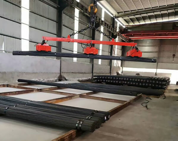 This MW38 which adopts unique magnetic circuit has good advantages in heat dispersion, penetration, (for example it can penetrate air gap through multiple layers) and can lift and transport bar material, flat iron and angle iron in unpacked or simple packed situation. It improves problem like big deflection when lift round steel and thread steel. There are two kinds: normal & high temperature type. Normally multiple units are used in operation, so two or four connection points are used for linking hanging beam.
